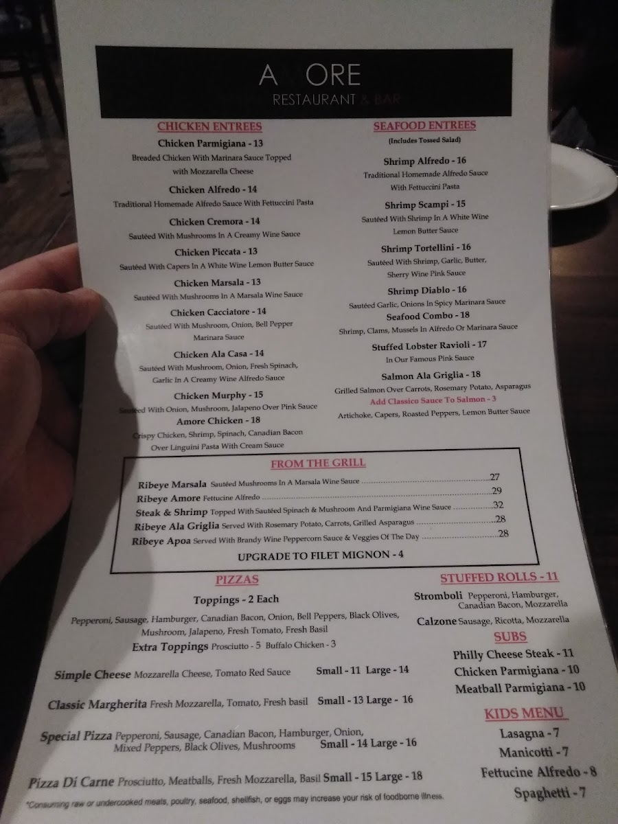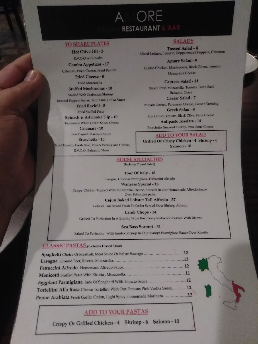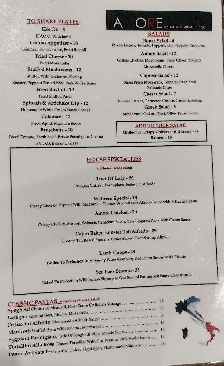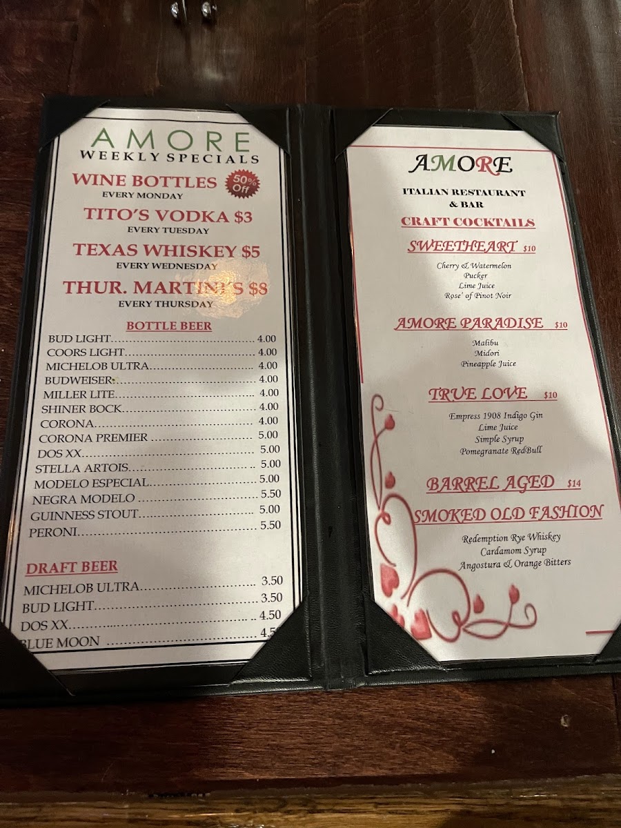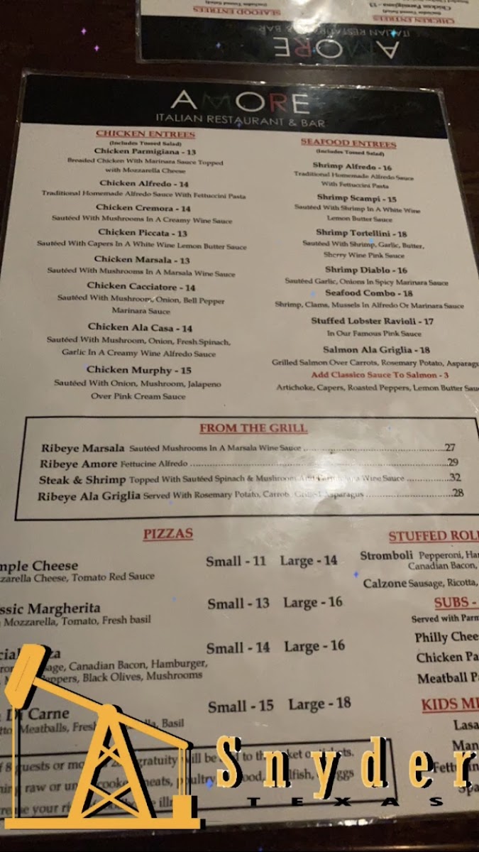 Welcome to Amore Italian Restaurant & Bar, a delightful gem nestled in Snyder, Texas. This charming eatery offers a diverse menu that celebrates authentic Italian flavors. Guests can indulge in tantalizing Chicken Entrées such as Chicken Marsala and Amore Chicken, each crafted with love and rich textures.